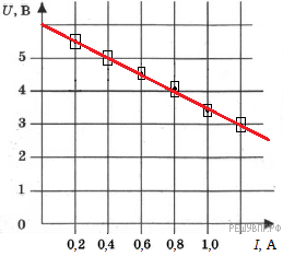 Из графика видно, что экспериментальные точки лежат на прямой и, значит, внутреннее сопротивление равно 2,5 Ом.