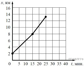 Версия для печати и копирования в MS WordНа прямолинейном участке шоссе находятся населённые пункты А, В и С. Координаты пунктов на оси Ох составляют, соответственно, 2 км, 8 км и 13 км. В начальный момент времени из пункта А начинает движение автобус и через 15 мин. доезжает до пункта В. Не останавливаясь в пункте B, ещё через 10 мин. он достигает пункта С. Постройте график зависимости координаты автобуса от времени на всём пути. Движение между пунктами А и В, а также между пунктами В и С считать равномерным.