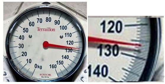 Из рисунка видно, что между метками «120» и «130» укладывается 10 делений, значит, цена деления составляет 1 кг. По условию погрешность измерения равна цене деления. Стрелка находится на отметке 126 кг. Таким образом, показания весов: (126 ± 1) кг.