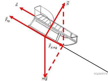 Санки равнозамедленно скатываются по наклонной плоскости в поле силы тяжести. Нарисуйте все силы, действующие на санки и направление их ускорения.