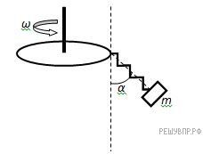 К диску, вращающемуся с постоянной угловой скоростью, прикреплена пружина, на конце которой висит груз массы m. Нарисуйте все силы, которые действуют на груз в системе отсчета, связанной с диском, если известно, что угол α при вращении диска не изменяется.