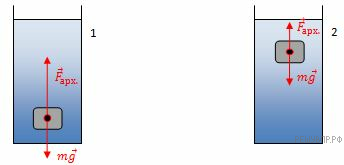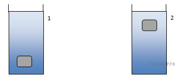 В момент времени 1 тело массы m было погружено на глубину h в стакан с жидкостью. Затем до момента времени 2 тело всплывало и остановилось на определенной глубине. Нарисуйте все силы, действовавшие на тело в момент времени 1 и в момент времени 2.