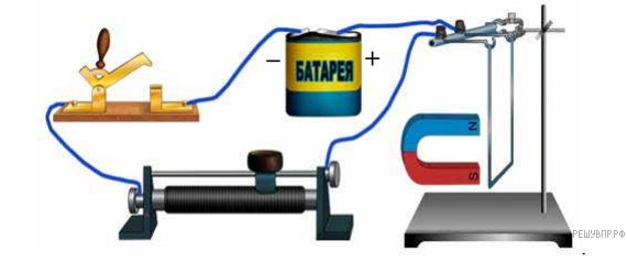По прямому горизонтальному проводнику, висящему на длинных тонких проволоках, пропускают электрический ток от батарейки. К проводнику подносят постоянный подковообразный магнит с указанными магнитными полюсами. В результате проводник отклонился от вертикали так, как показано на рисунке. Укажите полярность клемм батарейки.