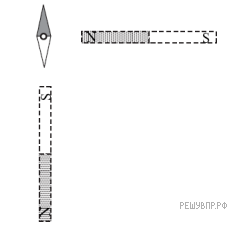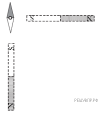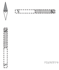 Магнитная стрелка компаса зафиксирована (северный полюс затемнен, см. рис.). К компасу поднесли сильный постоянный полосовой магнит, затем освободили стрелку, она повернулась и остановилась в новом положении. Изобразите новое положение стрелки.