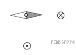 Магнитная стрелка компаса зафиксирована (северный полюс затемнен, см. рис.). К компасу поднесли на равном расстоянии два проводника с одинаковым постоянным электрическим током (проводники расположены перпендикулярно плоскости рисунка), затем освободили стрелку, она повернулась и остановилась в новом положении. Изобразите новое положение стрелки.