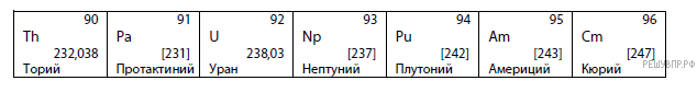 На рисунке изображён фрагмент Периодической системы химических элементов Д. И. Менделеева. Изотоп урана испытывает α-распад, при котором образуются ядро гелия и ядро другого элемента. Определите, какой элемент образуется при α-распаде изотопа урана.
